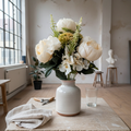 Ivoryelle No. 48 vereint üppige Pfingstrosen, markante Disteln und texturreiche Hortensien mit abgestimmtem Beiwerk zu einem kompakten Kunststrauss in Creme. Mit 48 cm Höhe, voll gearbeiteten Blütenköpfen und lebendiger Struktur setzt er elegante Akzente auf Sideboard, Esstisch oder Empfang – reduziert auf eine zeitlose, fotografietaugliche Präsenz.
