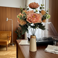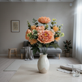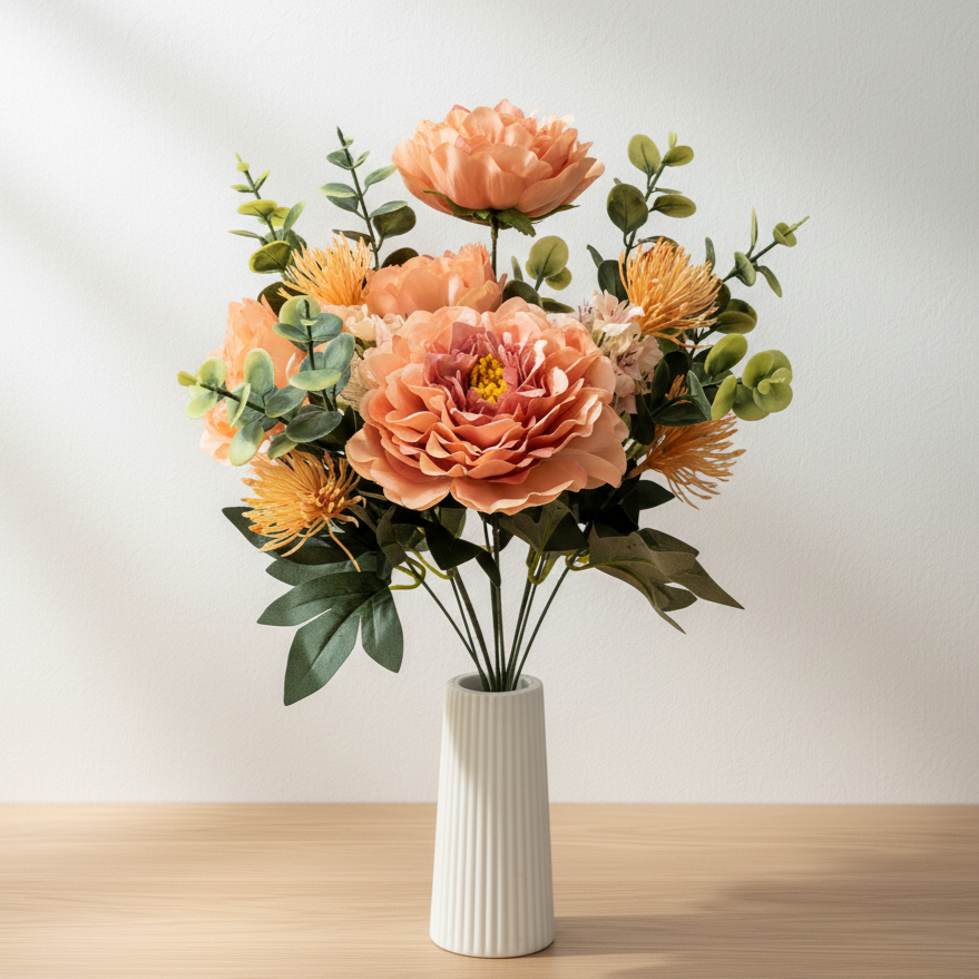 Persica No. 46 verbindet üppige Pfingstrosen, aromatischen Eukalyptus und charaktervolle Disteln mit abgestimmtem Beiwerk zu einem kompakten Kunststrauss in Pfirsich. Mit 46 cm Höhe, voll gearbeiteten Blütenköpfen und lebendiger Struktur setzt er feine Akzente auf Sideboard, Esstisch oder Empfang – reduziert auf eine zeitlose, fotografietaugliche Präsenz.
