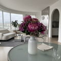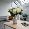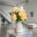 Solara No. 46 kombiniert üppige Pfingstrosen mit texturreichen Hortensien zu einem kompakten Kunststrauss in Gelb, Rosa oder Creme. Mit 46 cm Höhe, weichen Blütenvolumen und ruhiger Silhouette setzt er freundliche Akzente auf Sideboard, Esstisch oder Empfang – reduziert auf eine zeitlose, fotografietaugliche Präsenz.